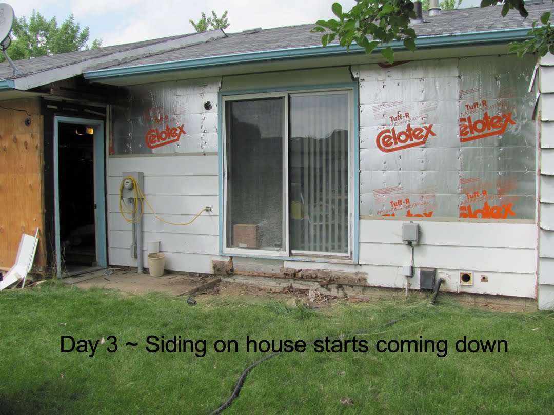 Day 13 (today) Put a second coat of paint on the trim. Pulled some weeds in the garden, took the girls to the park and then went back to Grandpa's for lunch. After lunch I installed the siding trim around the rest of the garage door features and put siding up on one side of the big garage door and finished off the other side of the garage up to the top of that door. Yes there is a ton of doors in his garage!